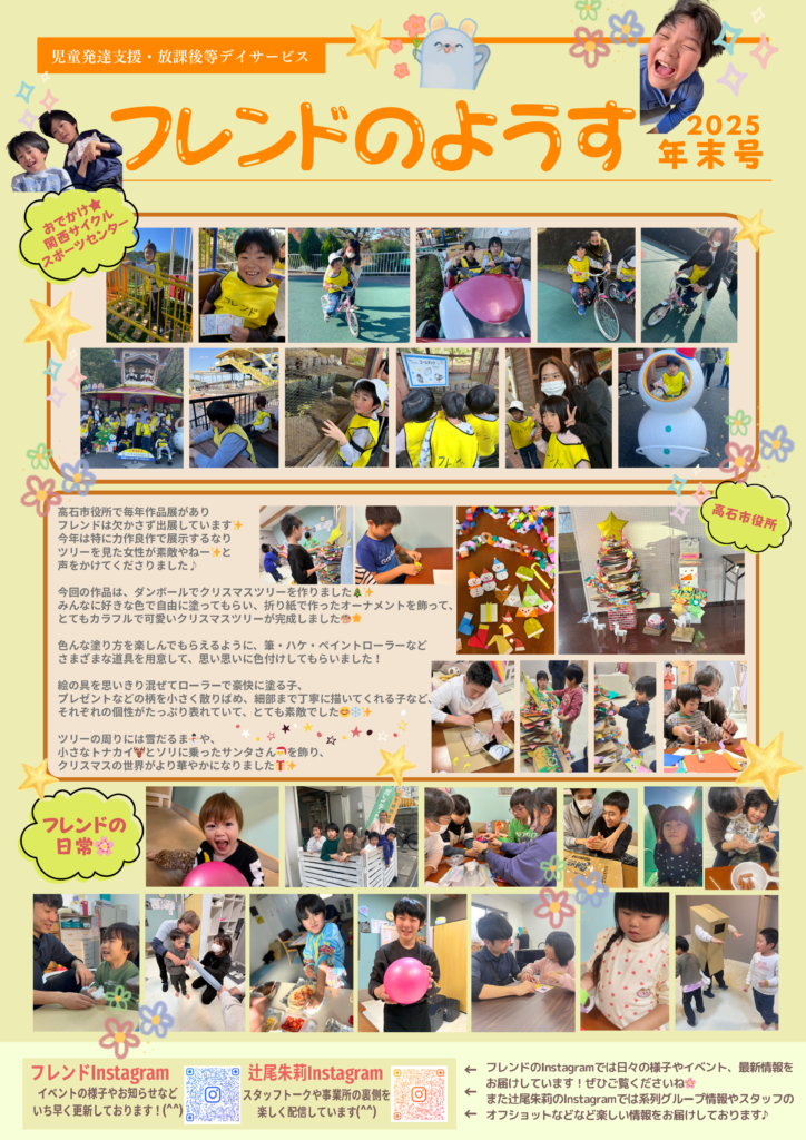 ◆ フレンドのようす(裏面) 裏面では、先日のおでかけ(関西サイクルスポーツセンター)の様子や、高石市役所の作品展に出展した「ダンボールクリスマスツリー」を紹介しています。 子どもたちがローラーや筆を使って思い思いに色付けした力作のツリー、とても素敵に仕上がりました!