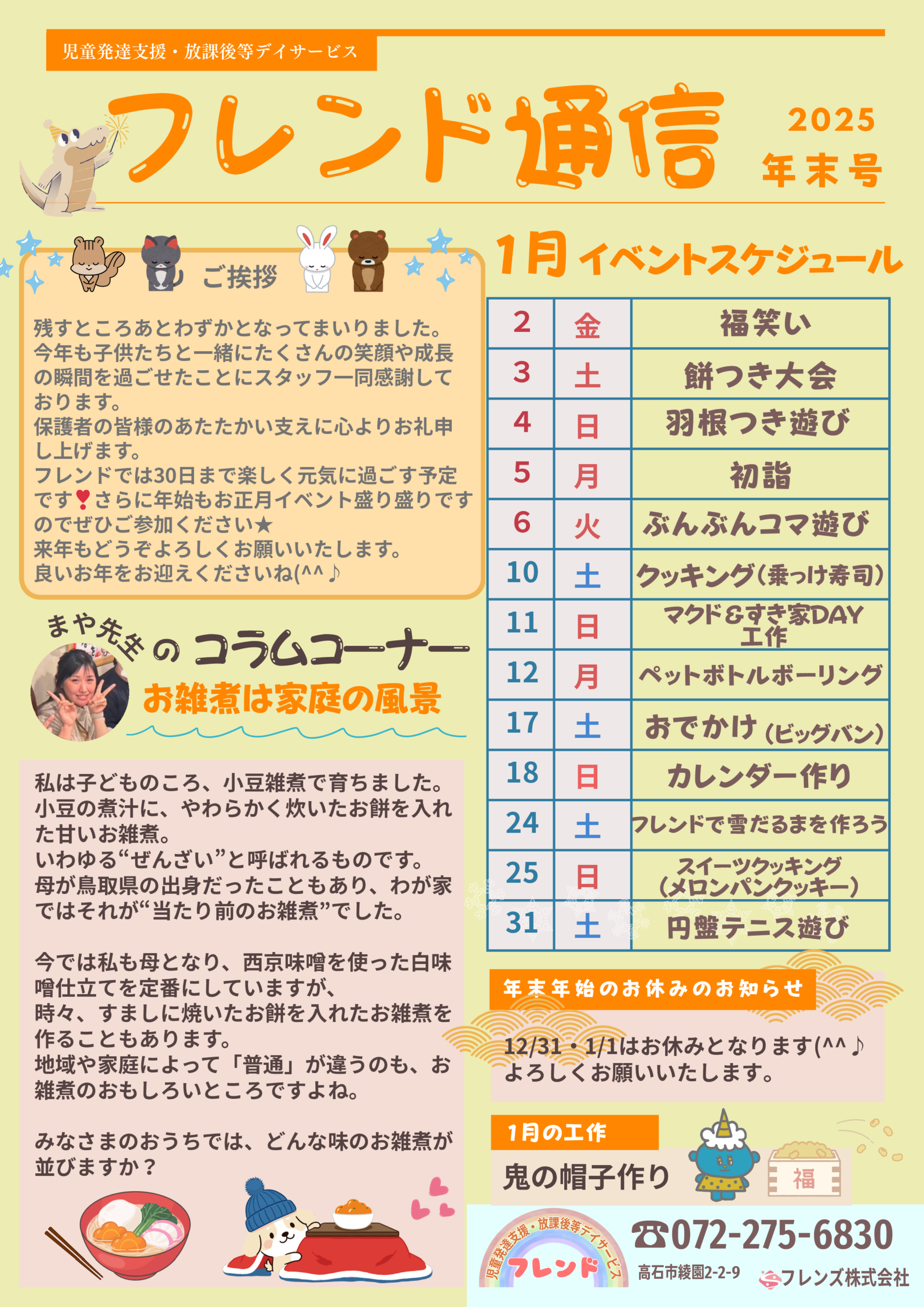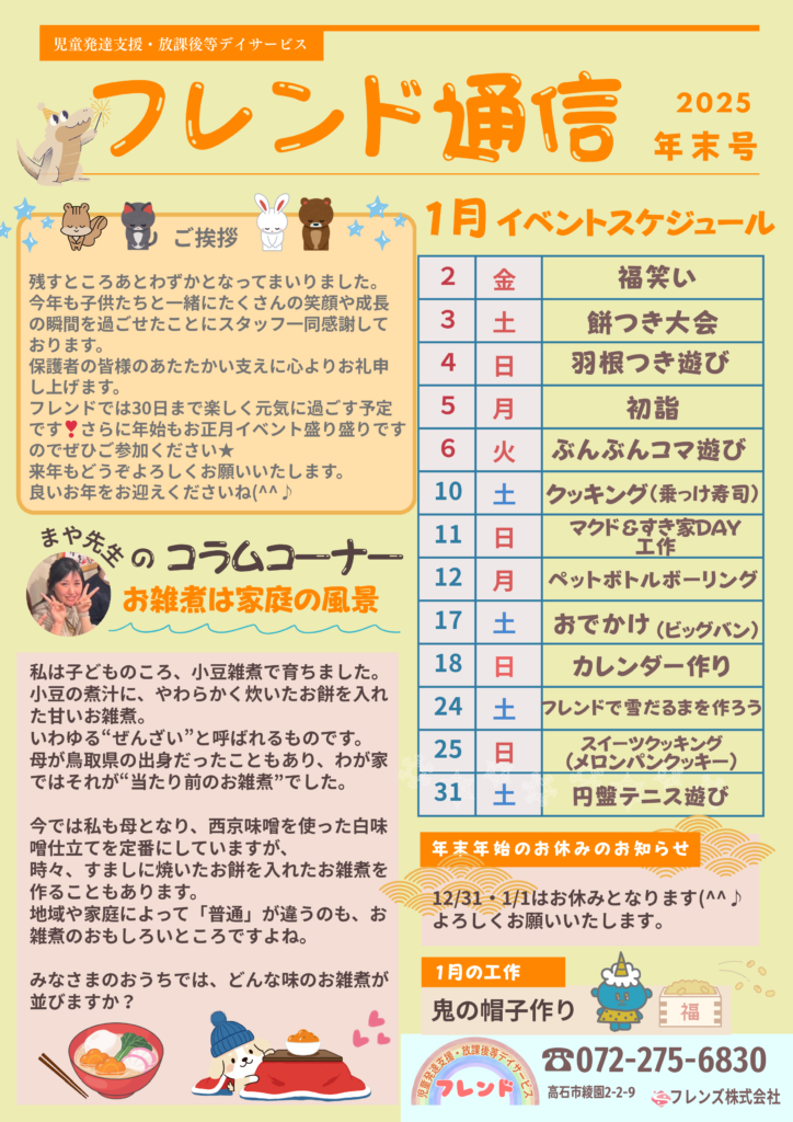 フレンドでは12月30日まで、子どもたちと楽しく過ごす予定です。 来年もどうぞよろしくお願いいたします。皆様、良いお年をお迎えください。