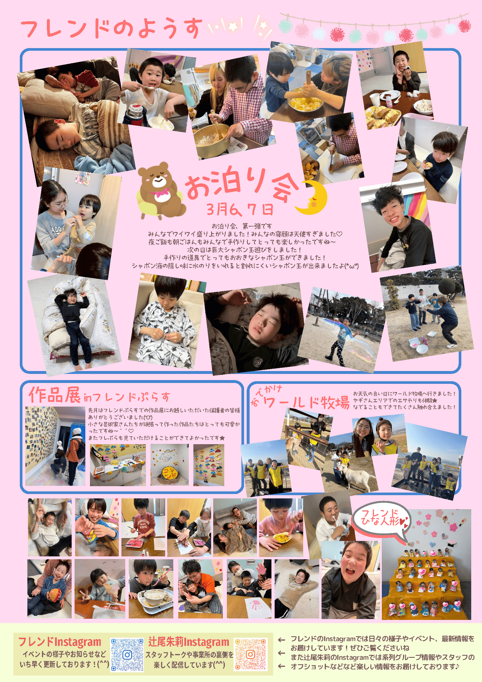 - お泊り会: 第1弾を開催!みんなで夜ご飯と朝ごはんを手作りし、次の日は水のりを隠し味にした「巨大シャボン玉」で遊びました 。